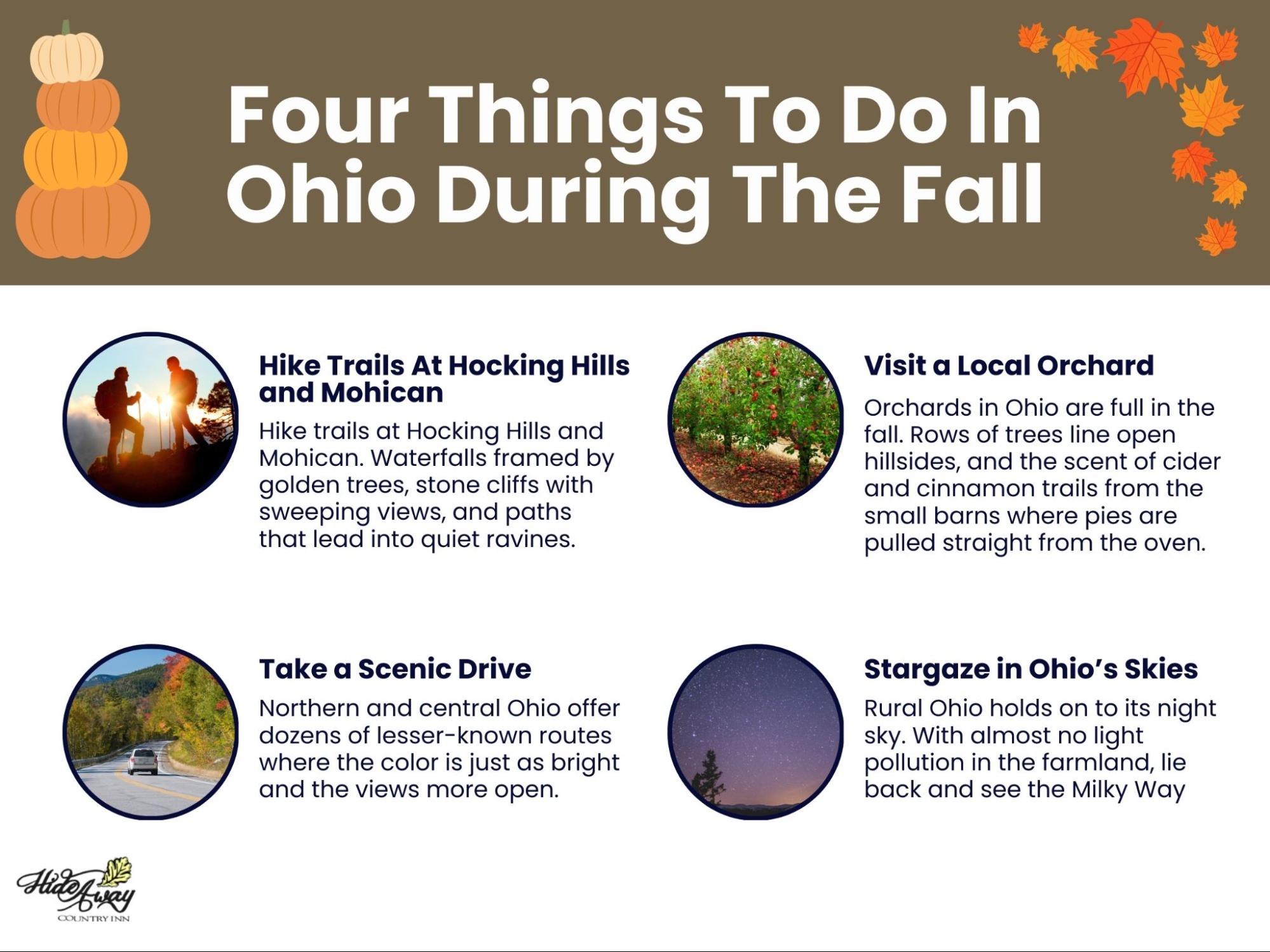 Northern and central Ohio offer dozens of lesser-known routes where the color is just as bright and the views more open. Around HideAway Inn, the backroads have a rhythm to them.