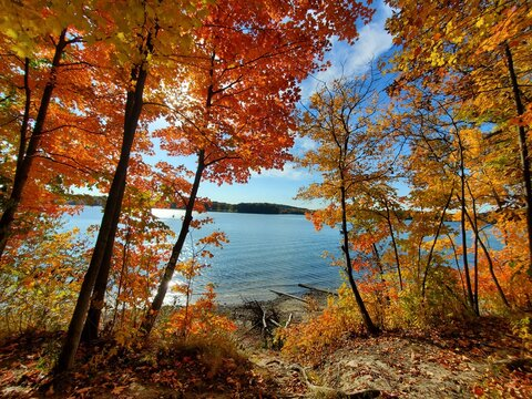 Different trees contribute different tones. Sugar maples are often the first to stand out, with a bold mix of orange and red. Red maples lean toward scarlet.