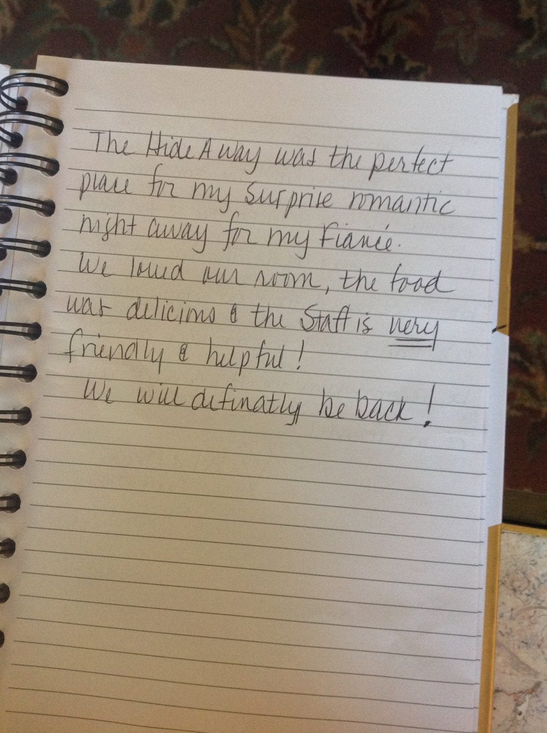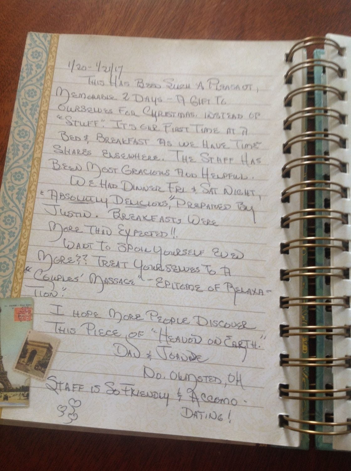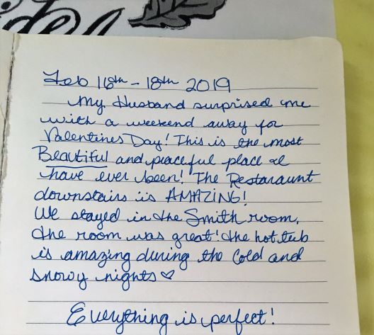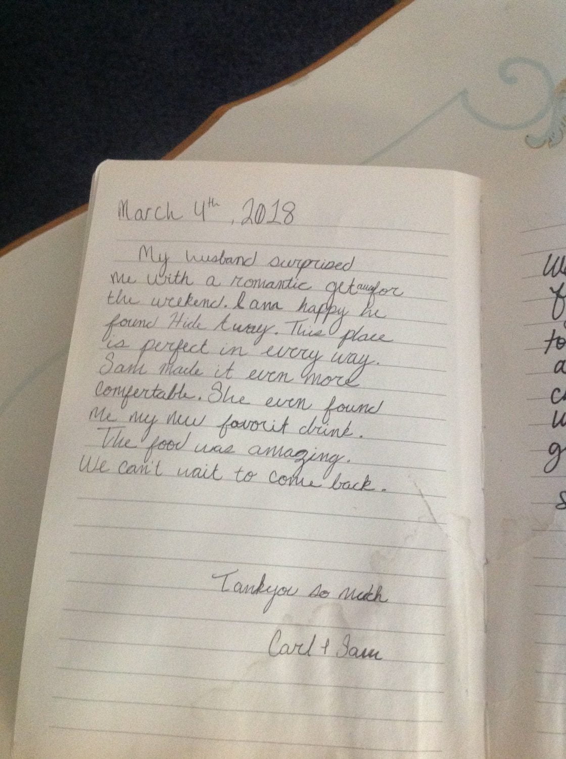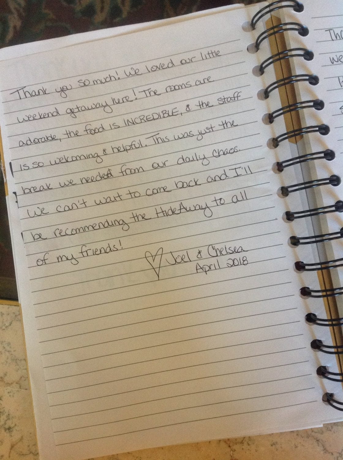 We love getting to read handwritten notes our guests leave after a wonderful stay at HideAway Country Inn! Many of our guests take the time to reflect on the highlights of their stay and provide us with insight into the reasons for their getaway…anniversaries, honeymoons, elopements and just plain down time to relax, reflect and renew!