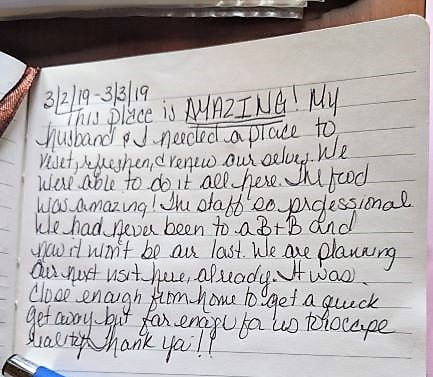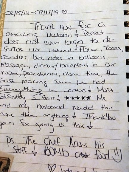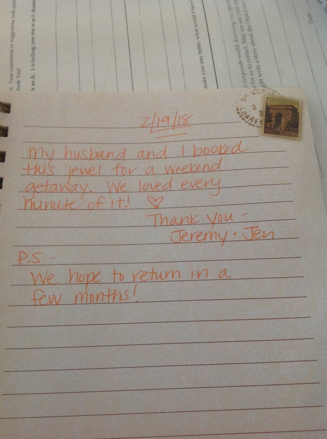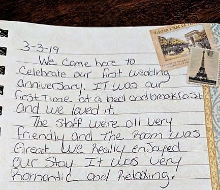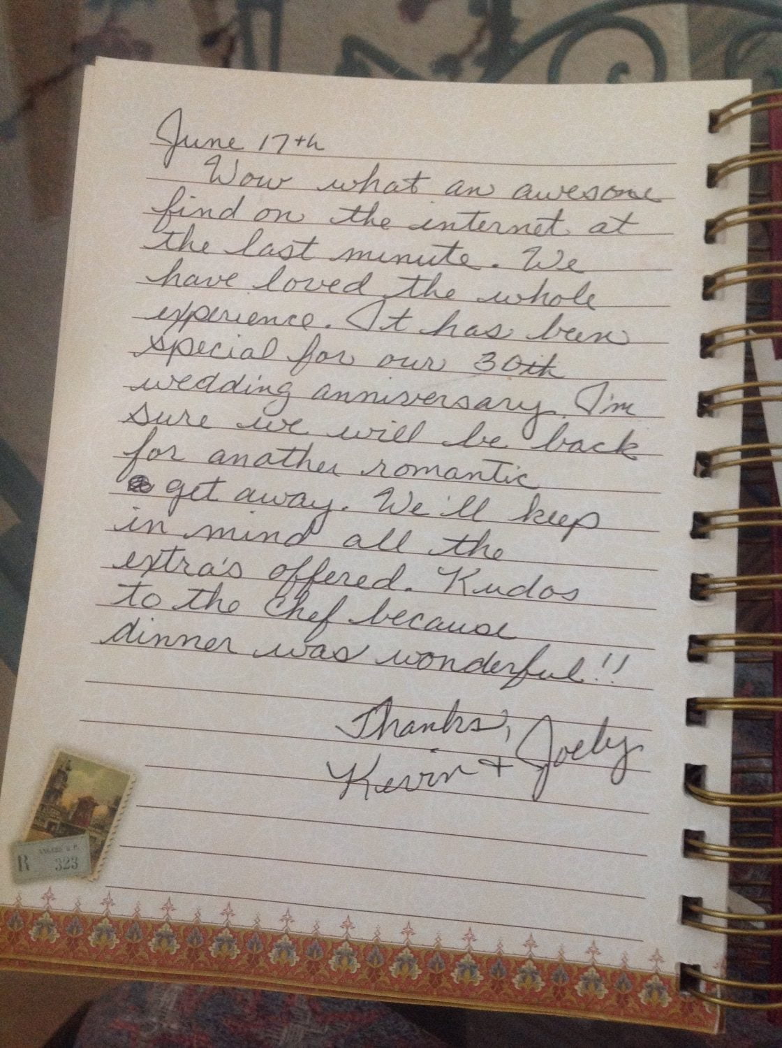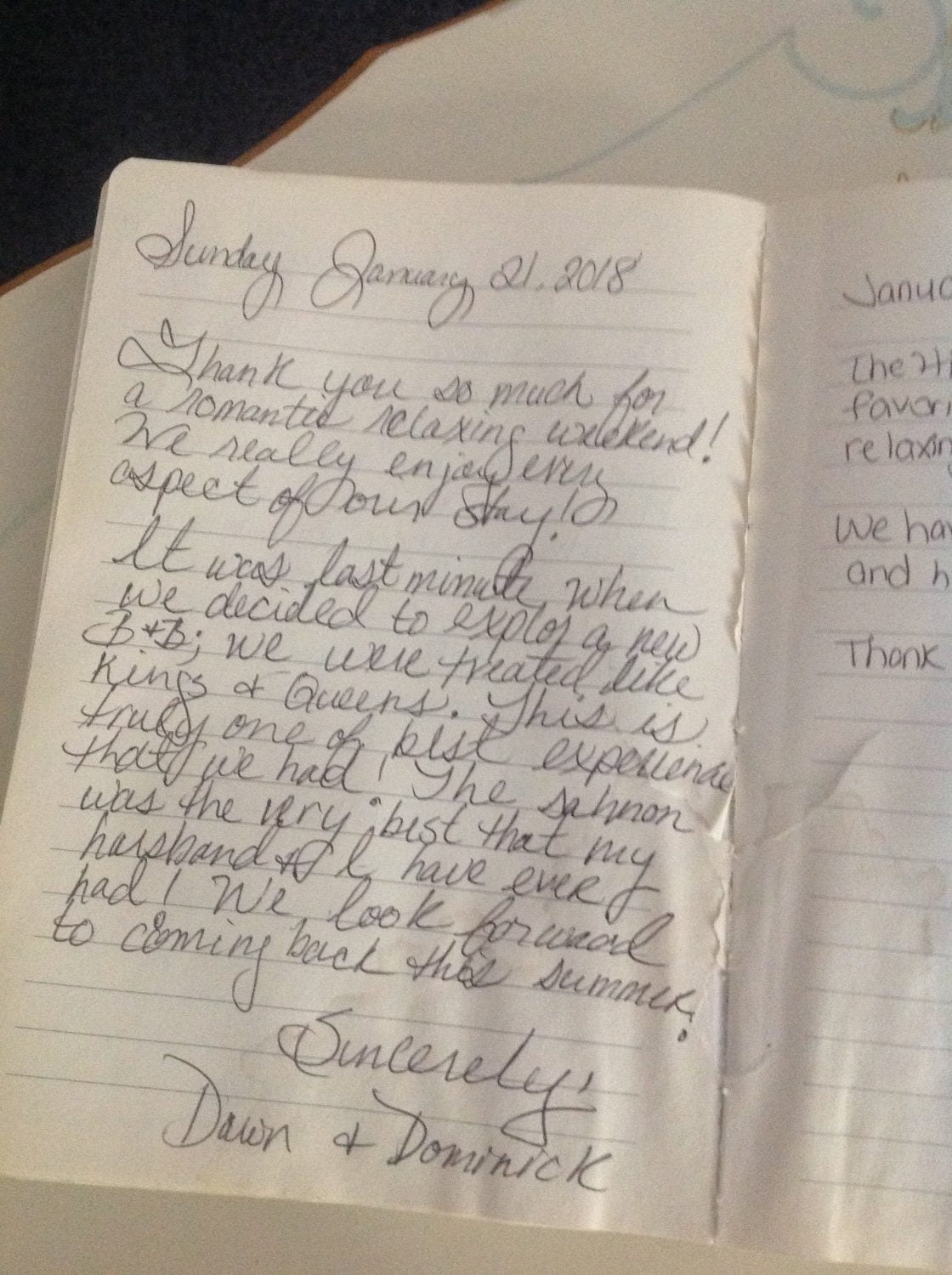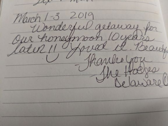 We love getting to read handwritten notes our guests leave after a wonderful stay at HideAway Country Inn! Many of our guests take the time to reflect on the highlights of their stay and provide us with insight into the reasons for their getaway…anniversaries, honeymoons, elopements and just plain down time to relax, reflect and renew!