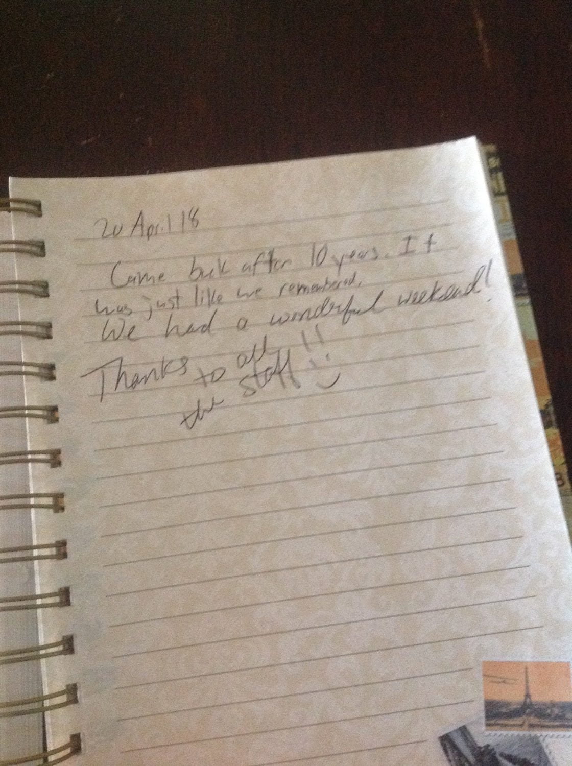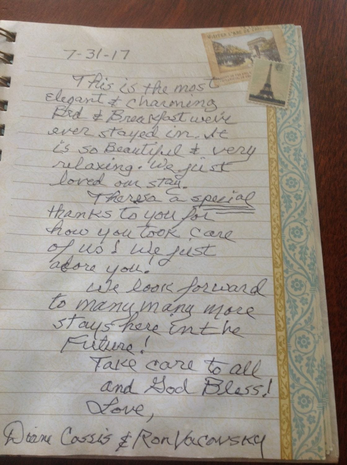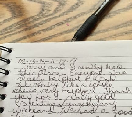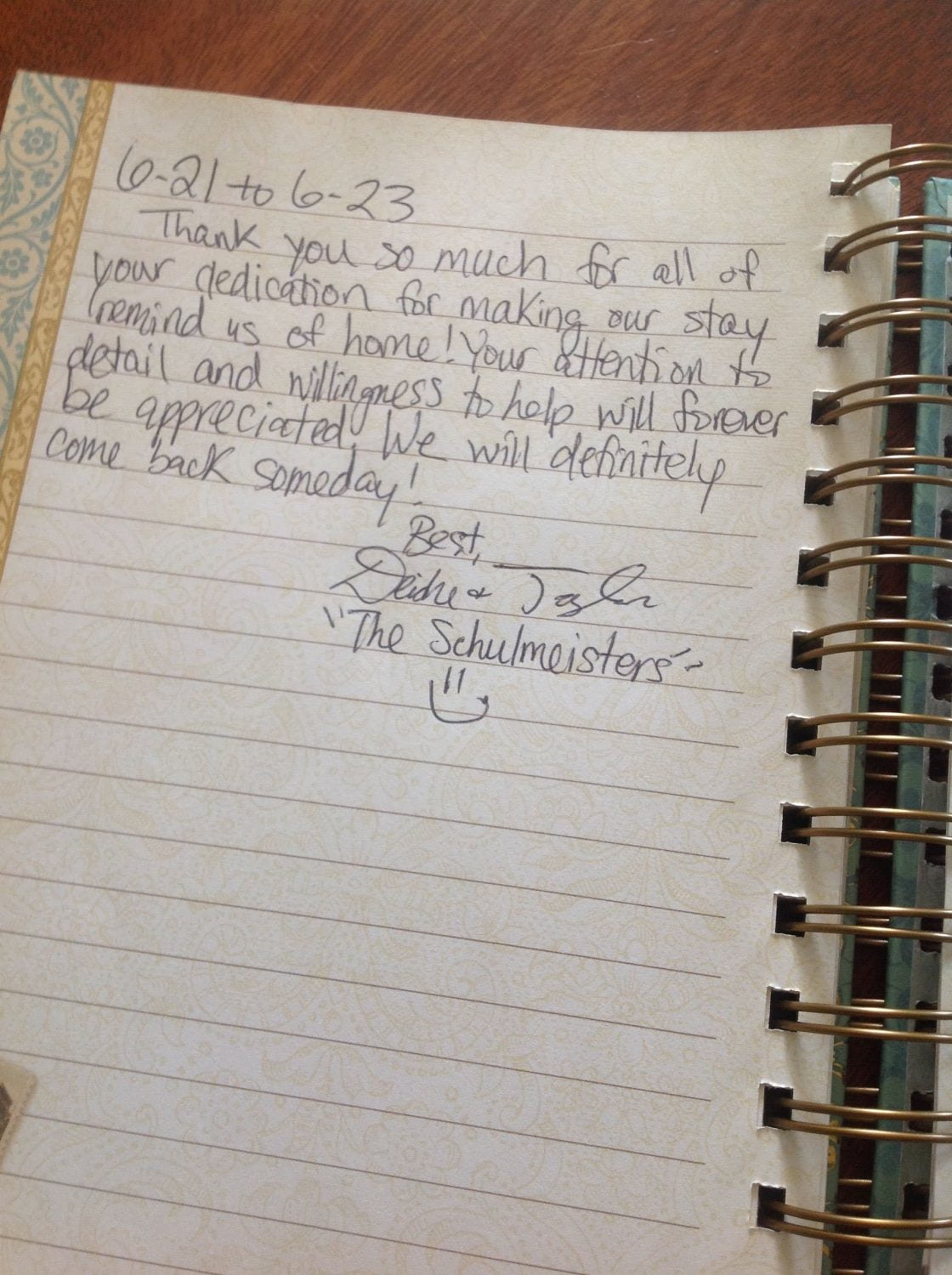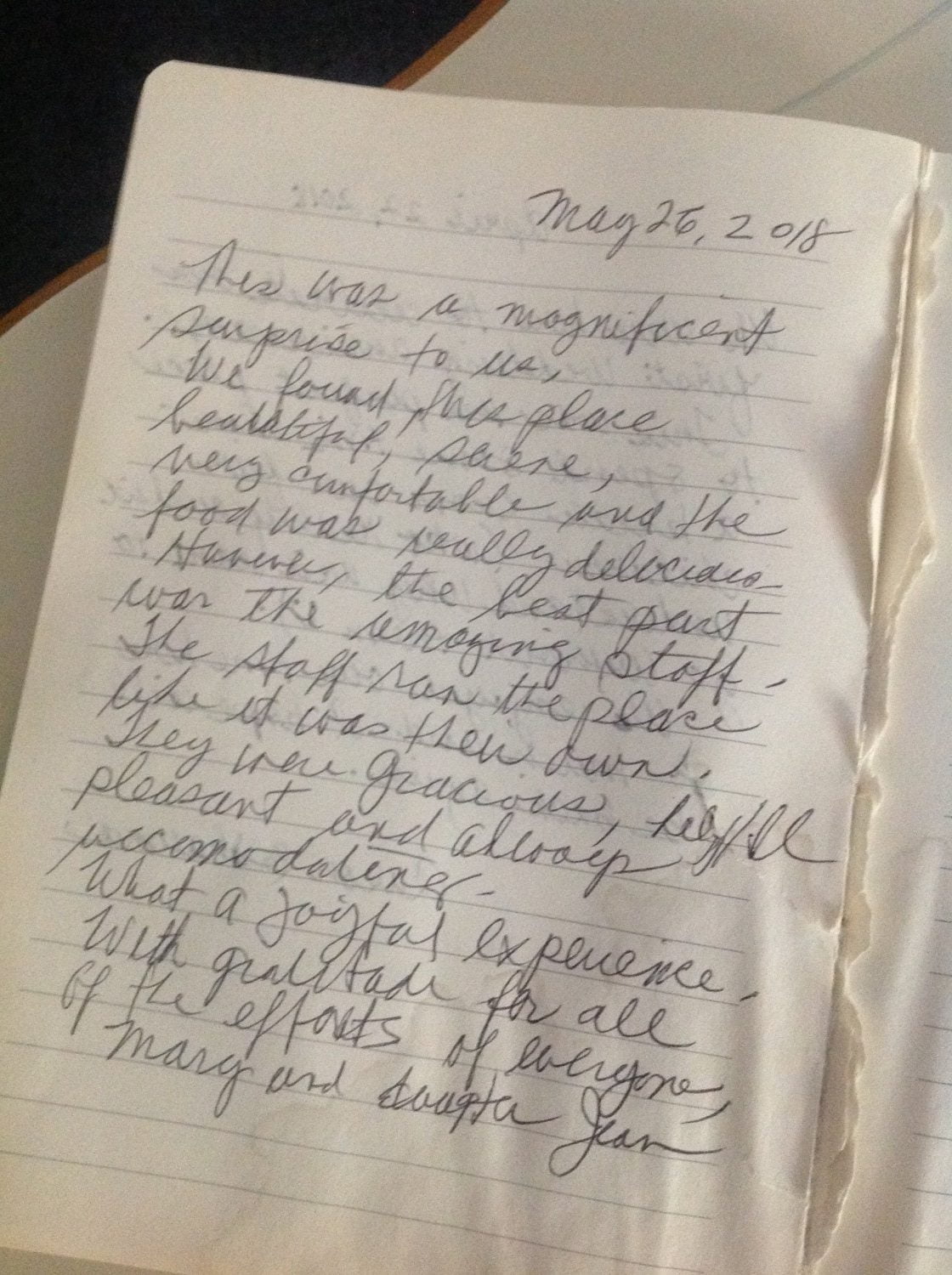 We love getting to read handwritten notes our guests leave after a wonderful stay at HideAway Country Inn! Many of our guests take the time to reflect on the highlights of their stay and provide us with insight into the reasons for their getaway…anniversaries, honeymoons, elopements and just plain down time to relax, reflect and renew!