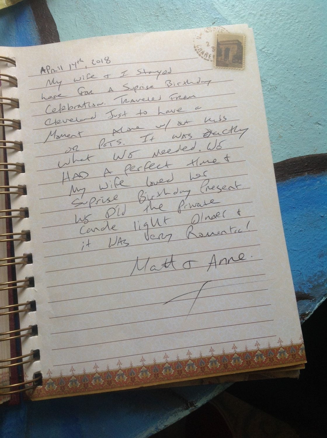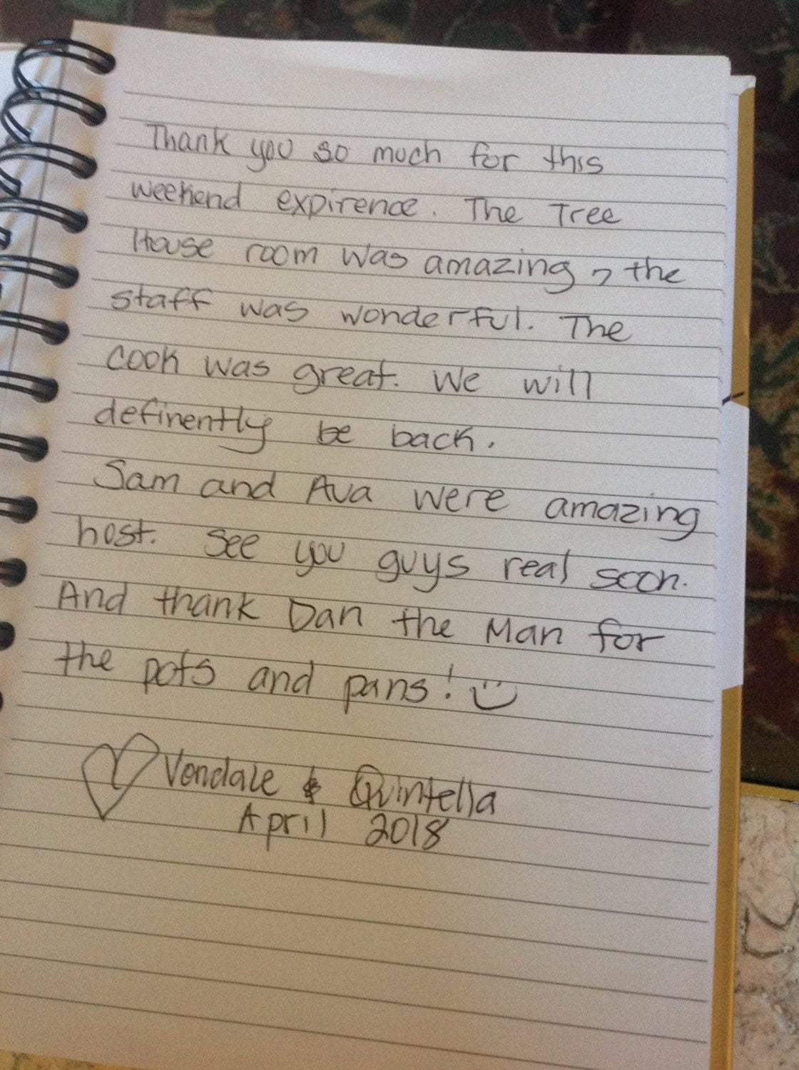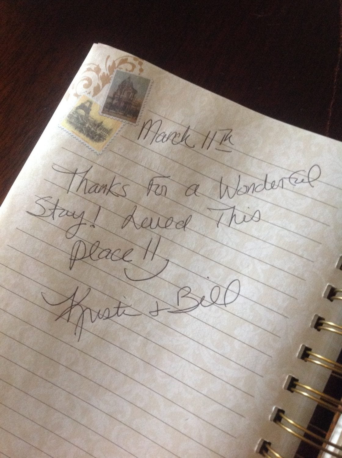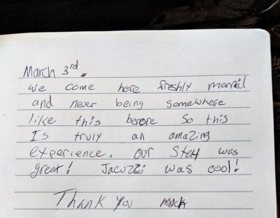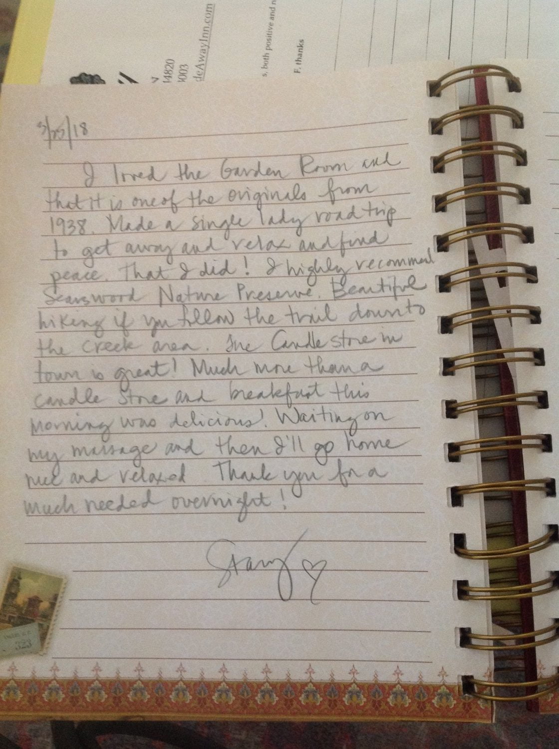 We love getting to read handwritten notes our guests leave after a wonderful stay at HideAway Country Inn! Many of our guests take the time to reflect on the highlights of their stay and provide us with insight into the reasons for their getaway…anniversaries, honeymoons, elopements and just plain down time to relax, reflect and renew!